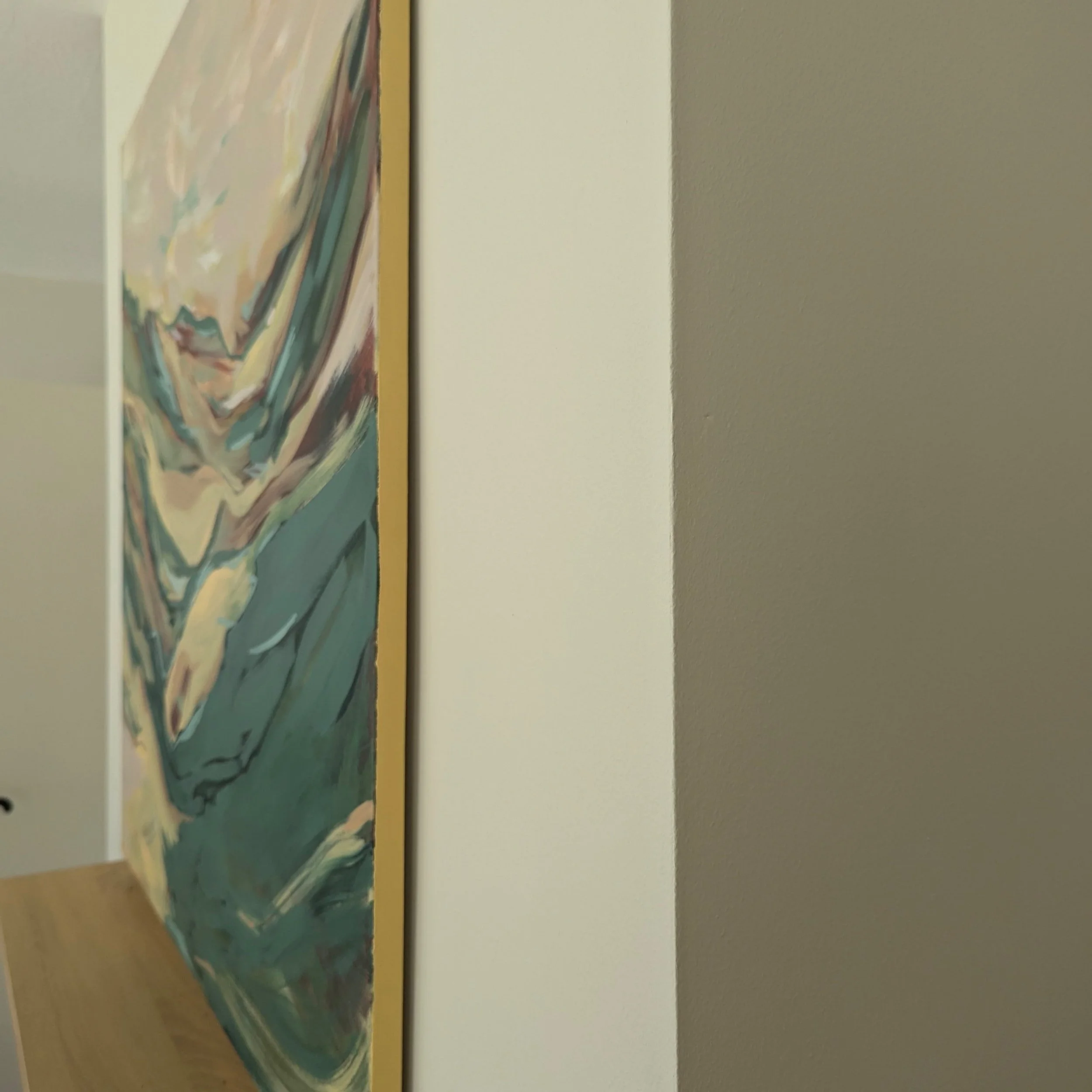 Recently finished it’s been really liberating to paint big again, this is something I used to do when I studied Art, when I depleted my student loan on large canvas and big pots of paint. 100 x 100CM it’s a bit more manageable and causes quite a striking piece on my mantlepiece, but it is for sale and as much as I will be delighted when it finds a new home I will miss her. Speak to the lovely Saira at ‘Discerning Palette’ for more information on how to purchase.